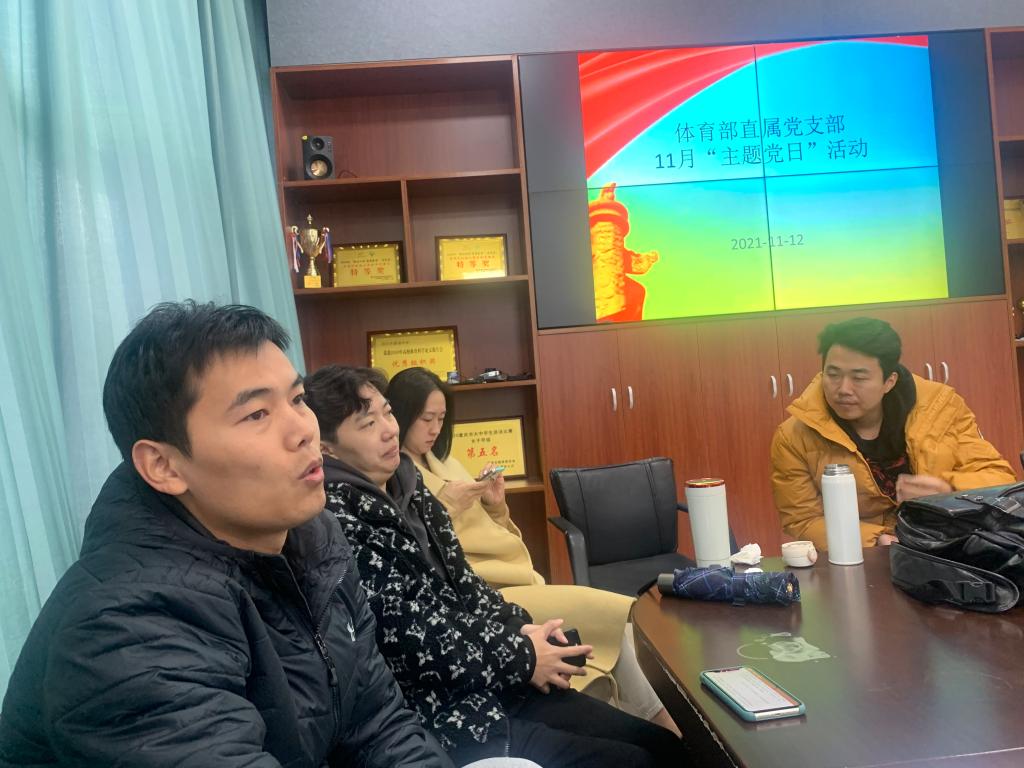 2021 年 11 月 12 日上午,体育部全体党员在会议室举行了 11 月“主题党日”活动。活动分为两个阶段:第一阶段是体育部副主任张勇同志讲党课;第二阶段是在学习习近平总书记“七一”重要讲话精神和相关文件后谈学习的心得体会交流发言。