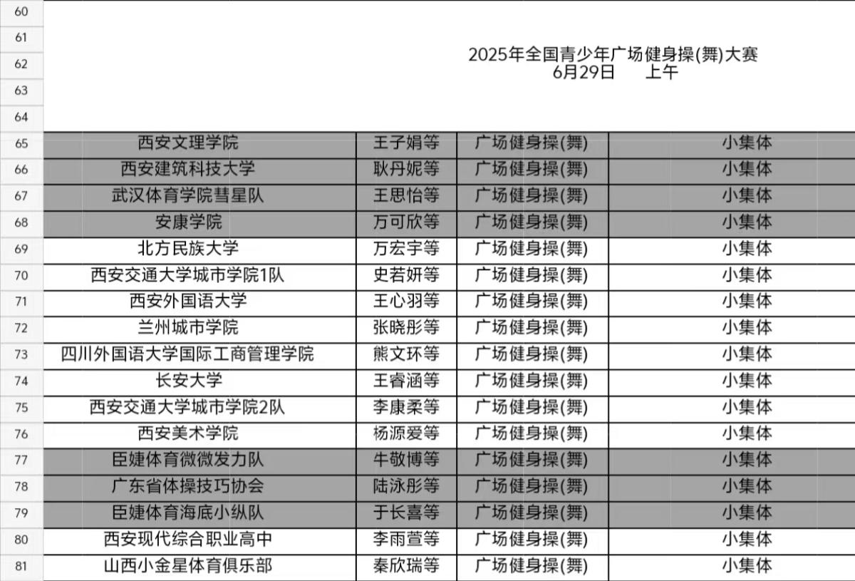 大赛为期两天,从6月28日持续至29日。赛事组委会精心规划竞赛项目,设置广场健身操(舞)自编套路小集体(6—12人)和大集体(13—24人)两大类别,并按照年龄及院校属性,科学划分为U9、U12、U15、U18、高校组(涵盖体育院校、普通院校、高职高专三类)、社会组(18—28岁)六大组别。多元的赛制吸引了来自全国各地的38支青少年队伍踊跃报名参赛,共同在舞台上挥洒汗水、绽放青春。