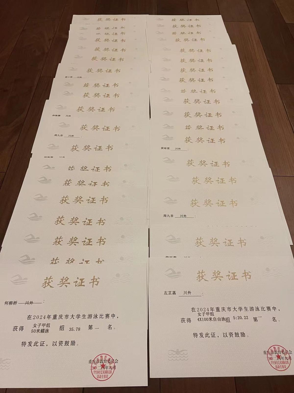 重庆市大学生游泳比赛于2024年9月28日在重庆大学(虎溪校区)游泳馆盛大开幕。此次比赛由重庆市教育委员会与重庆市体育局主办,重庆大学承办,全市19所高校的共213名学生运动员在23个项目中展开激烈角逐。在众多参赛队伍中,我校游泳队参赛人数少,通过奋勇拼搏,斩获4枚金牌、4枚银牌、3枚铜牌、共20 项奖项,同时在甲组女子4×100米自由泳接力中夺得冠军,打破了重庆大学多年来对该项目的垄断。最终,我校游泳队以甲组女团第三、甲组男团第七的优异成绩圆满结束。
