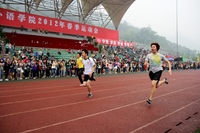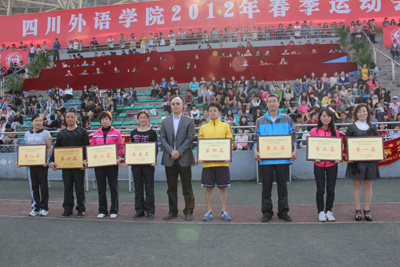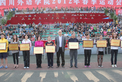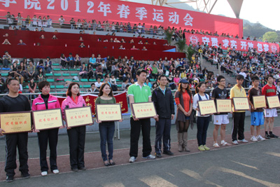 4月20号下午,我校2012年春季运动会闭幕式在西区运动场举行。至此,为期2天的运动会正式落下帷幕。新闻传播学院低年级获得学生组团体总分第一,国际关系学院11级名列第二,国际商学院10级获得第三。